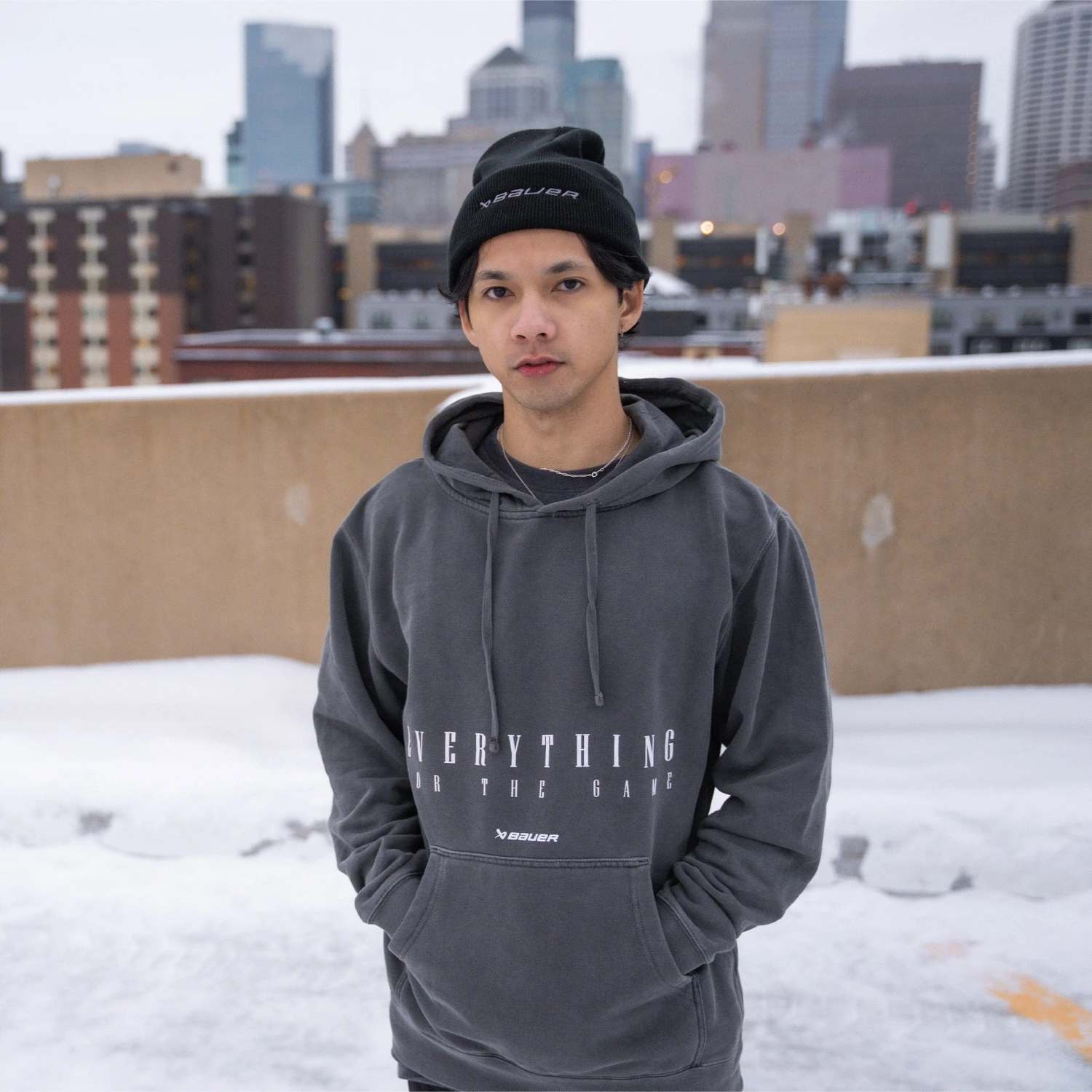 100% acrylic black toque with 12” knit and adjustable cuff. One size fits most. Embroidered Bauer logo/icon lockup.