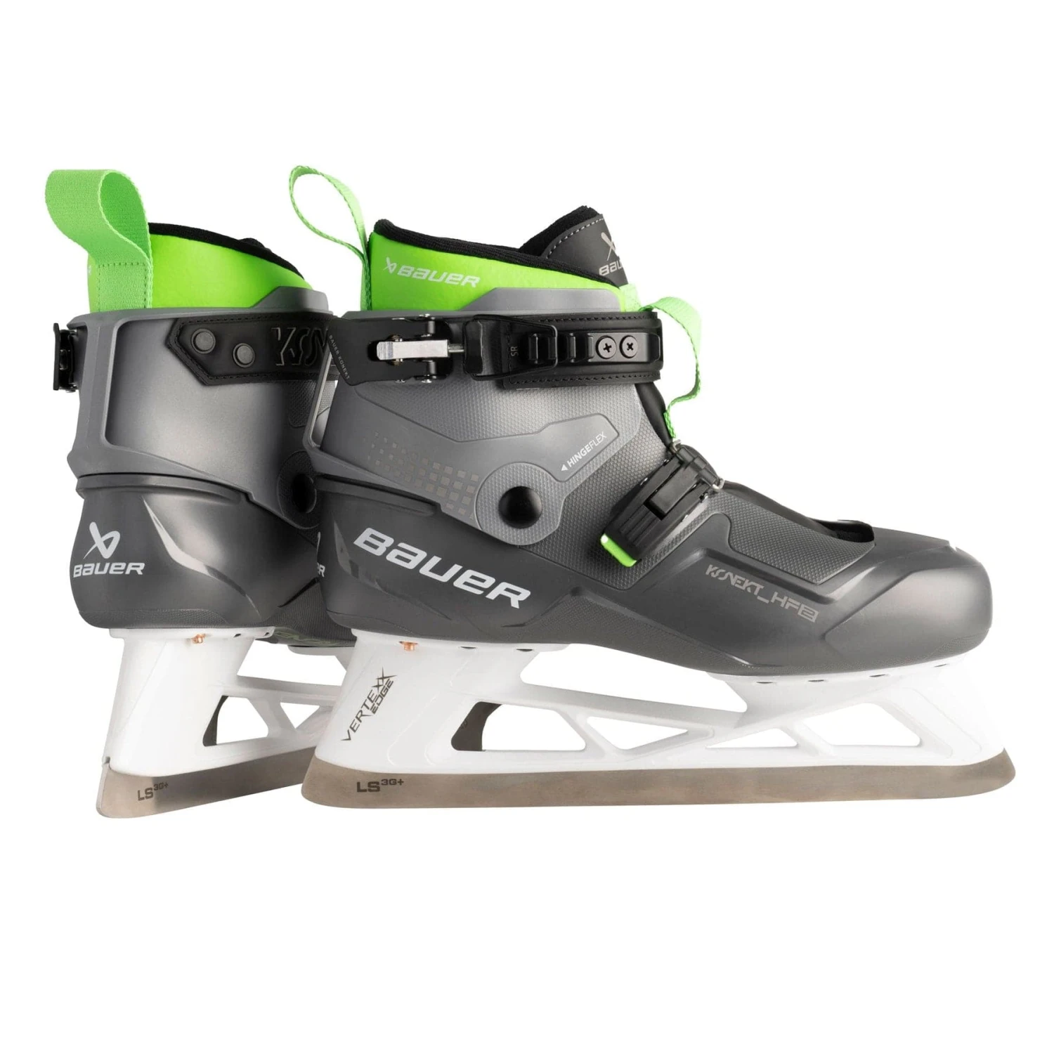 Unlike conventional skates, the Bauer KONEKT HF2 uses straps, cuffs, and buckles, similar to ski boots. The skates also use HingeFlex technology, which were also present in the original KONEKT skate. HingeFlex is the upper shell cuff of the boot that moves with your ankle when you move. HingeFlex ultimately makes the skate 22% more flexible in the ankle area. The two buckles at the ankles and toe of the foot are built to lock your foot in in a snap, making it quicker and easier than ever to get ready for the game.