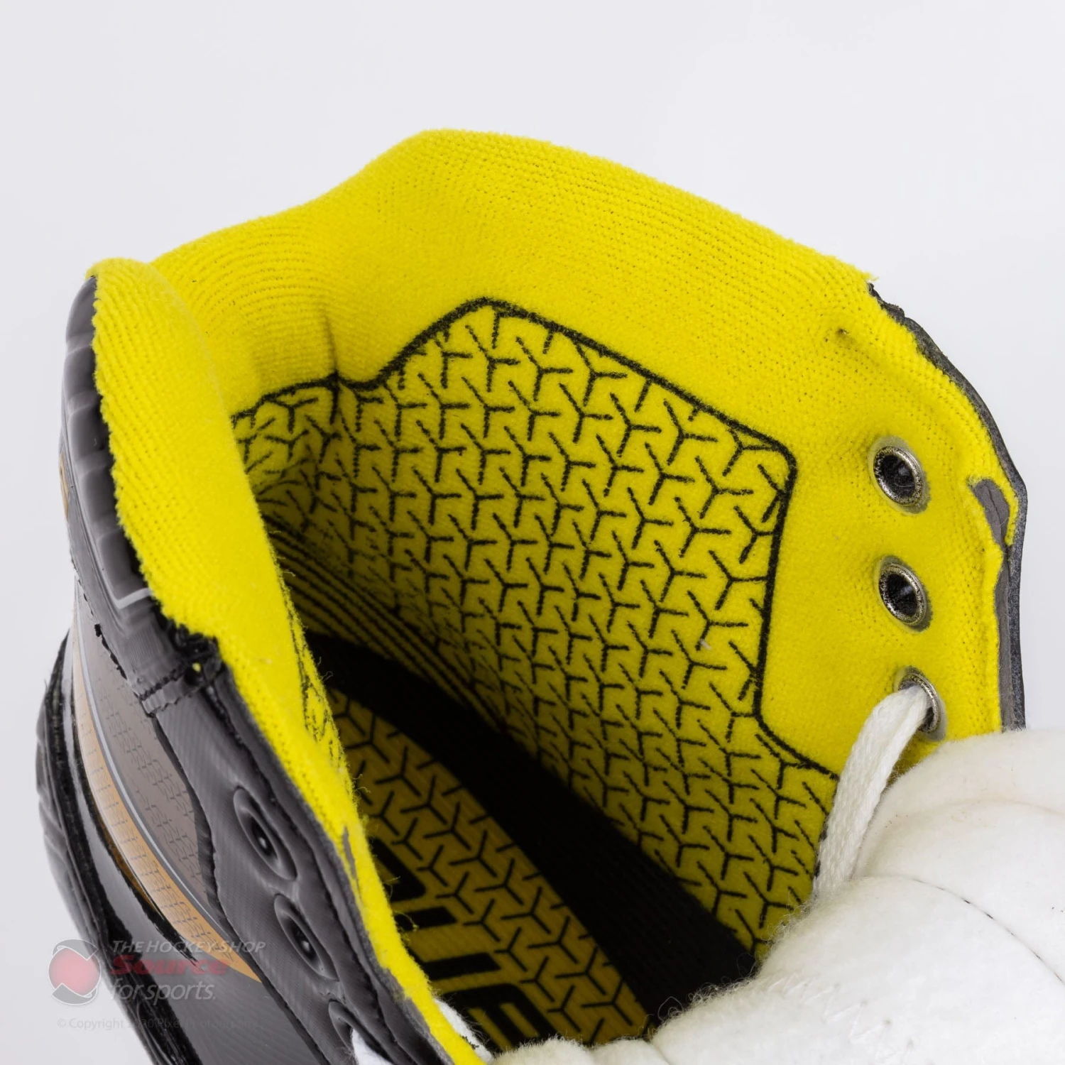 The Bauer Supreme 3S Goal Skates feature a black composite quarter with a double yellow stripe along with bright silver accents. A gloss black Supreme outlined logo runs the length of the skate while a silver and gold 3S logo sits on the back of the ankle combined with a gold supreme logo on the top of the heel giving the new 3S skates a sharp look that stands out.