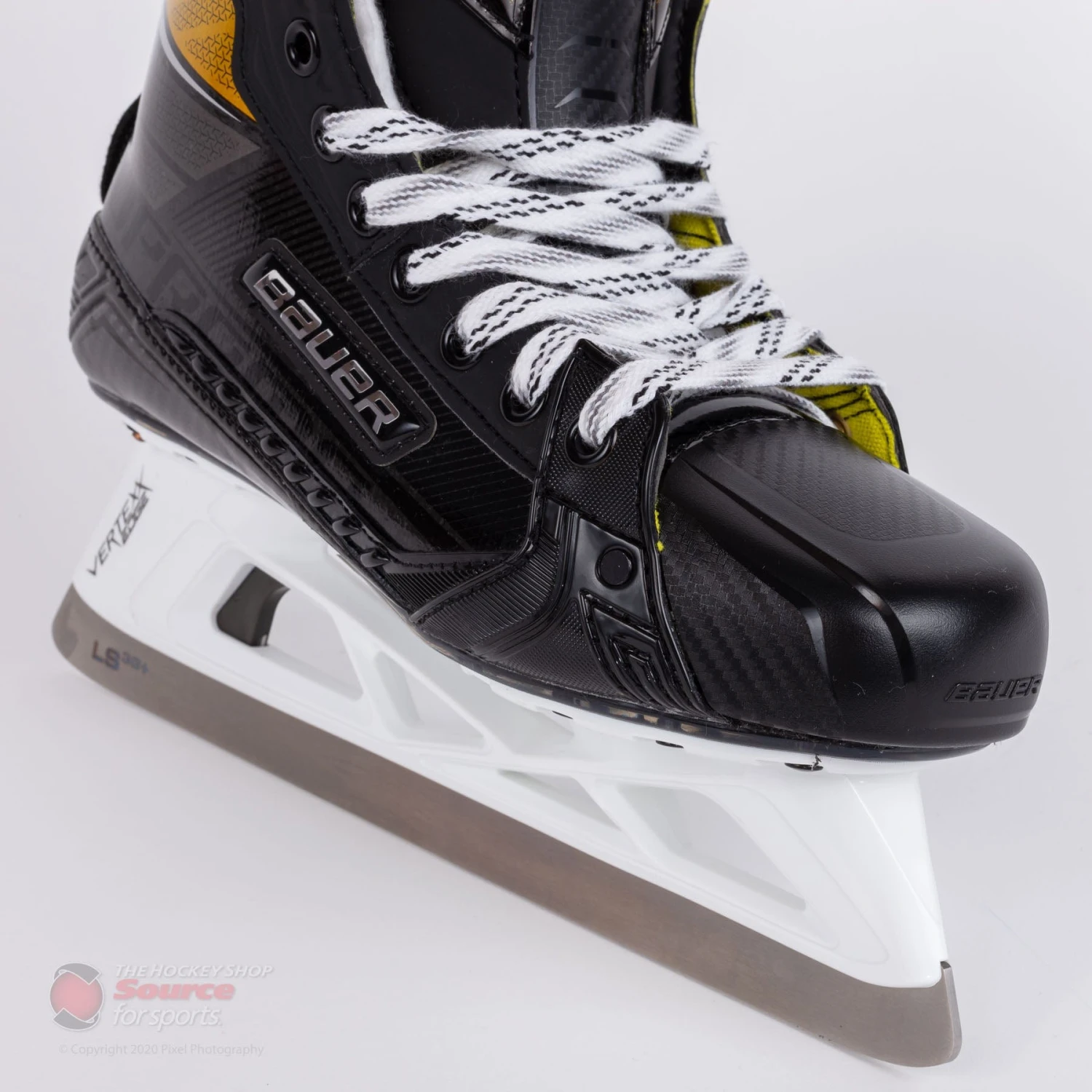 The Bauer 3S Pro goalie skates are made using a 3D Curv Composite quarter keeping the boot stiff while maximizing energy transfer. They feature Bauer’s new Asymmetrical toe cap which cuts down on weight while giving the best possible attack angle available on the market. The 3S Pro also uses a larger, fixed Lundy loop in order for easier boot strap connection.This skate is ideal for those hitting the ice a lot or those wanting a longer lifetime for their skates.